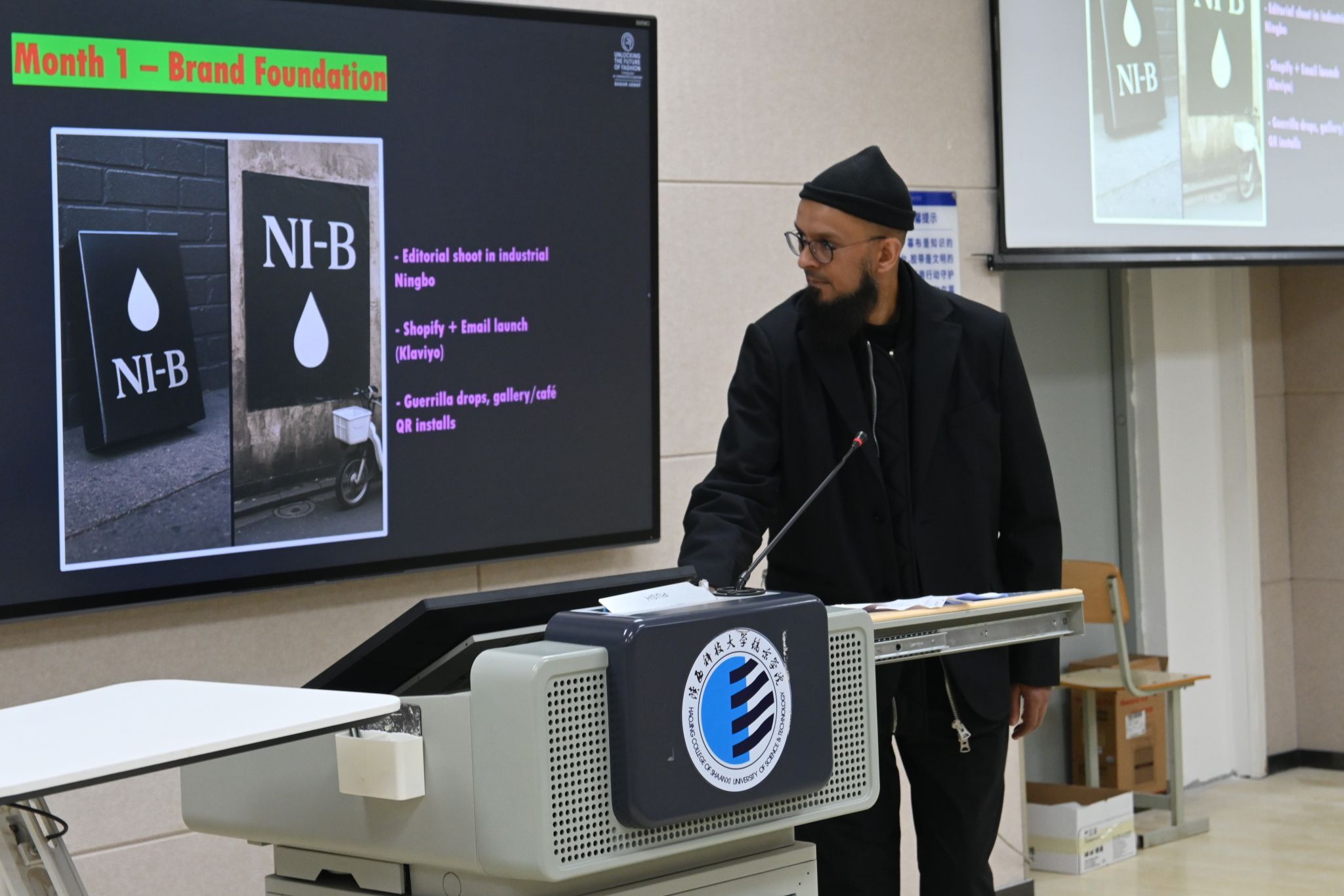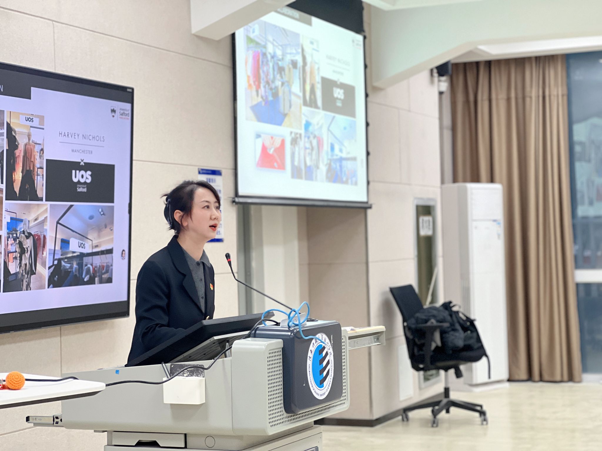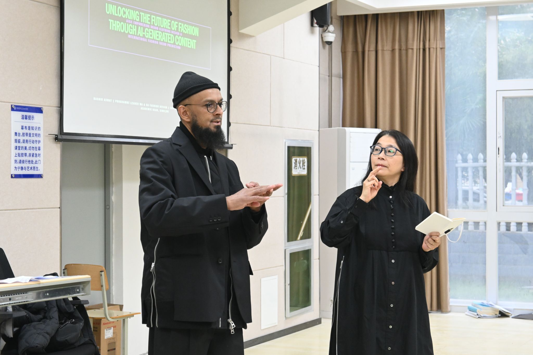 为深化国际交流合作,推动人工智能技术与时尚教育深度融合,2025年10月23日,我院特邀英国索尔福德大学时尚设计专业负责人,英国时尚理事会成员Bashir Ahmed Aswat教授,及索尔福德大学针织设计导师Aaminali Aswat工程师,为全院师生带来一场题为“以AIGC开创时尚的未来”的专题讲座。